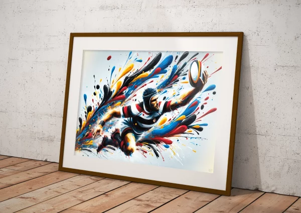 « Éclat du mouvement » est une célébration visuelle de l’instant, où chaque détail raconte l’histoire d’un mouvement chargé de puissance et d’émotion. L’artiste a capturé l’essence d’une interception décisive du ballon, moment clé du rugby, avec une intensité qui semble presque éclater hors du cadre.